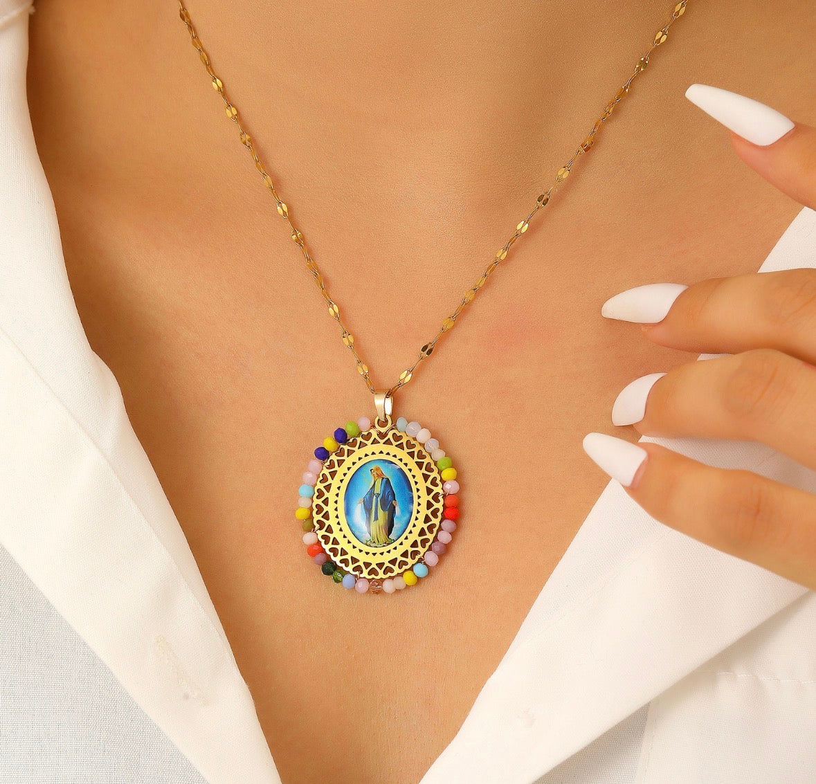 C1259 Collar dorado virgen del Rosario colorido acero inoxidable