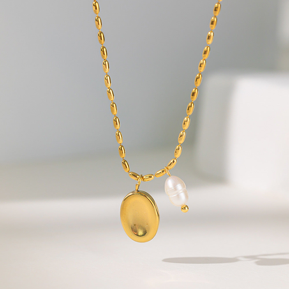 C641 Collar dorado ovalo perla acero inoxidable chapado en oro 18k largo 22cm dije 1cm