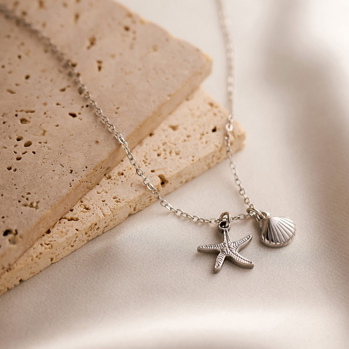 C644 Collar estrella de mar concha plateada acero inoxidable largo 23cm dijes 1cm