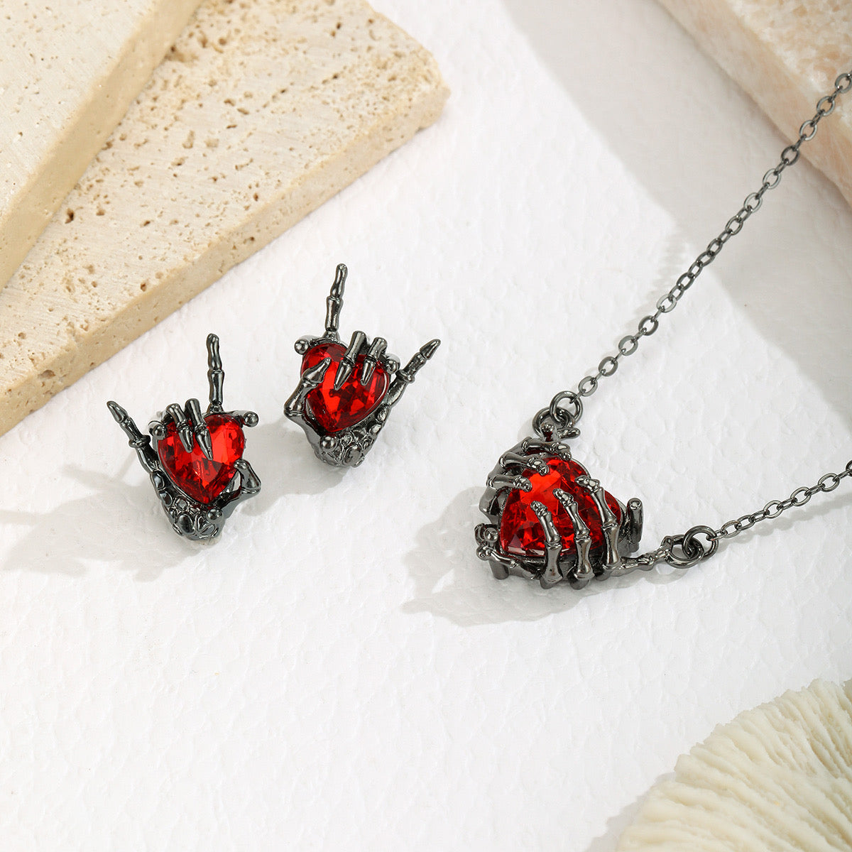 C846 Conjunto de collar aretes mano de esqueleto corazón aleacion 26cm largo 2cm dije 2cm aretes