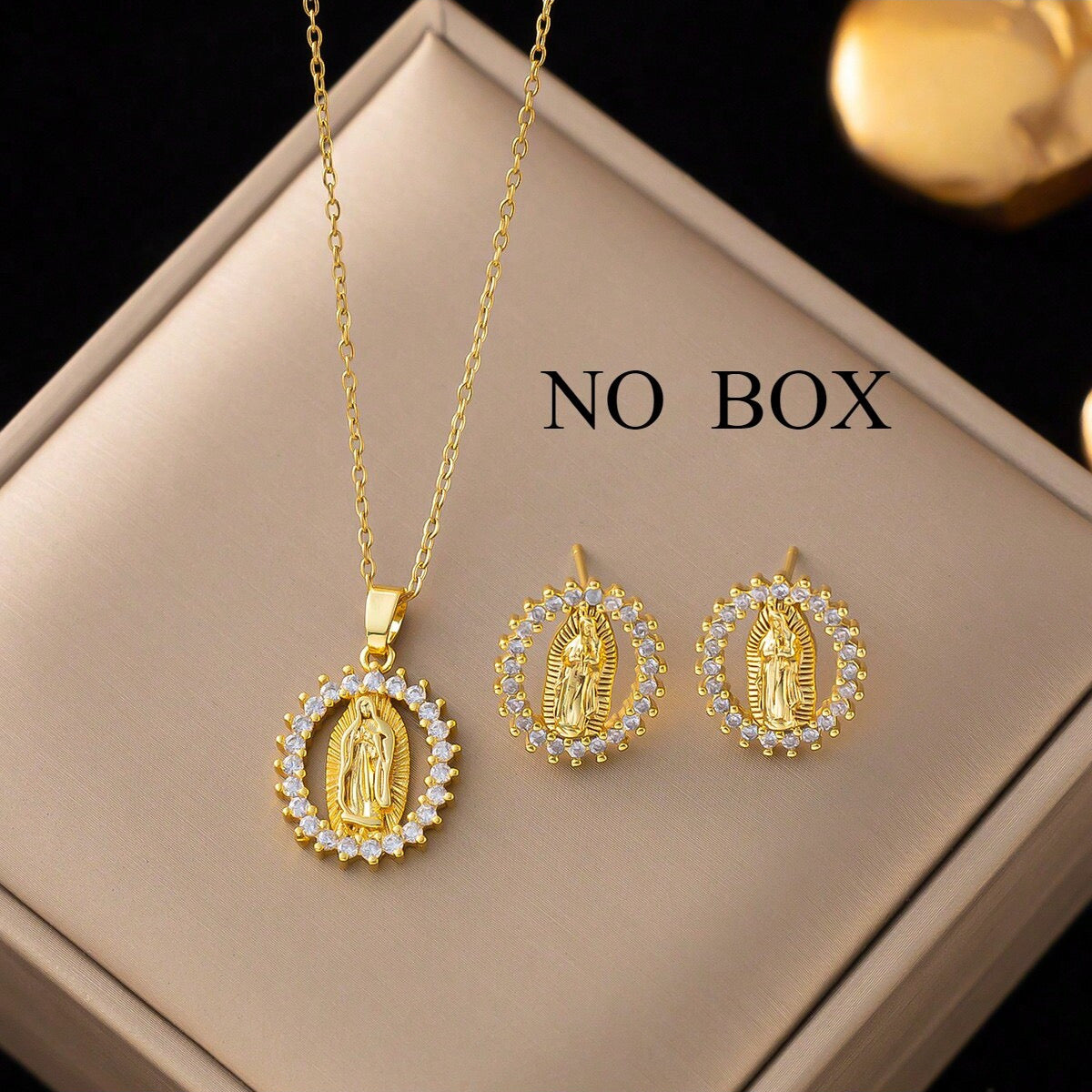 C897 Conjunto de collar aretes virgen de Guadalupe acero inoxidable 23cm largo 2cm dije 2cm aretes