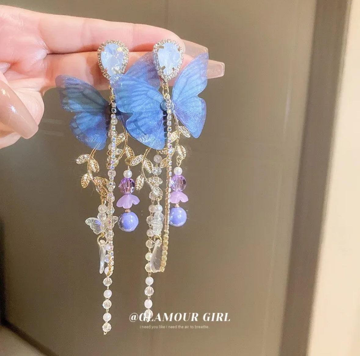 E3261 Aretes mariposa fiesta largos colgantes poste de plata 11cm