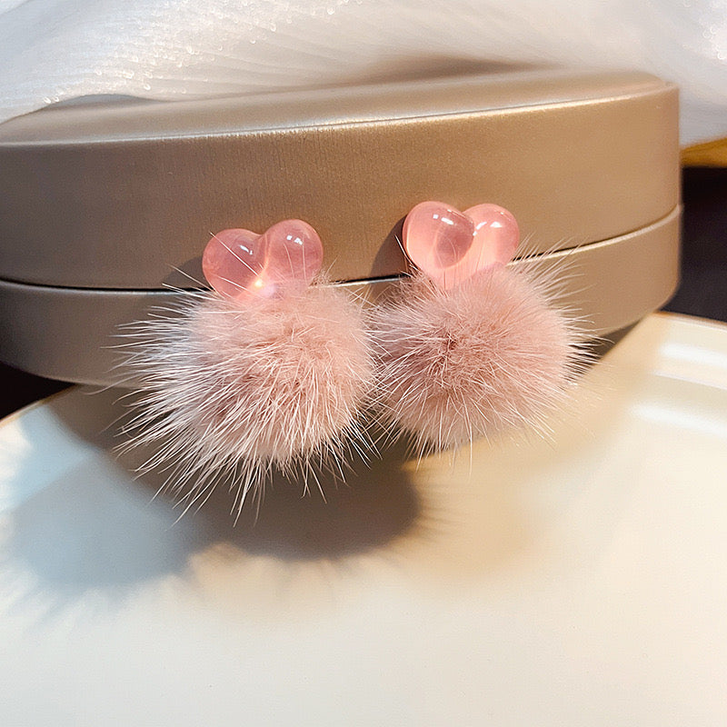 E3446 Aretes corazon pompon Rosa acrilico 5cm