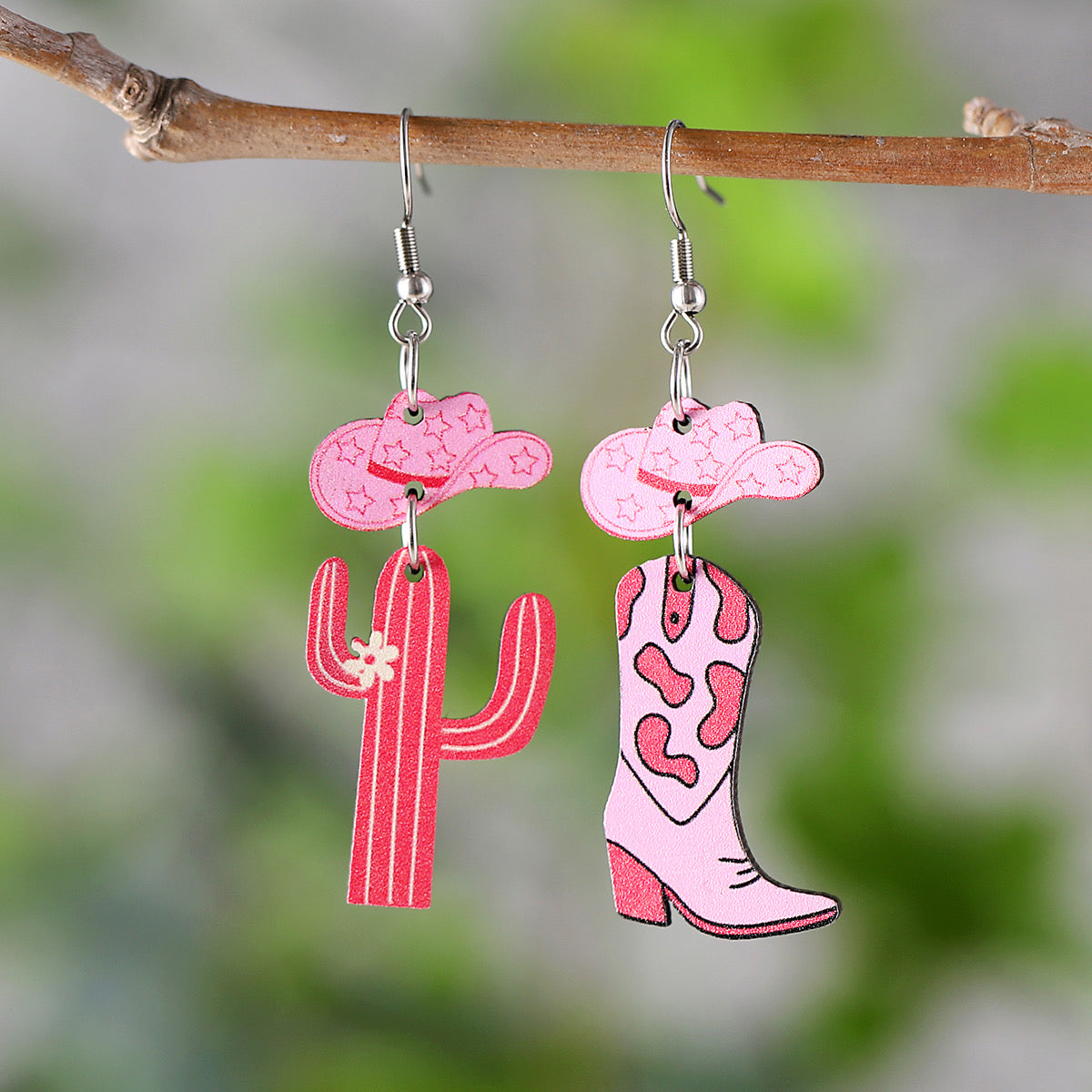 E4610 Aretes asimétricos cactus botas vaquero madera 4.2cm