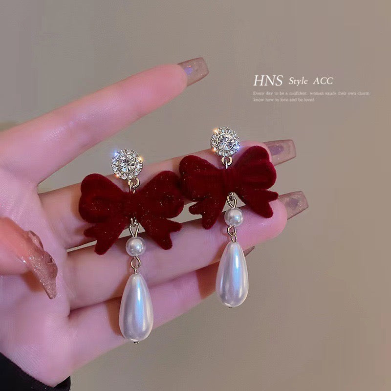 E4959 Aretes moño gamuza vino cristales brillantes 4cm