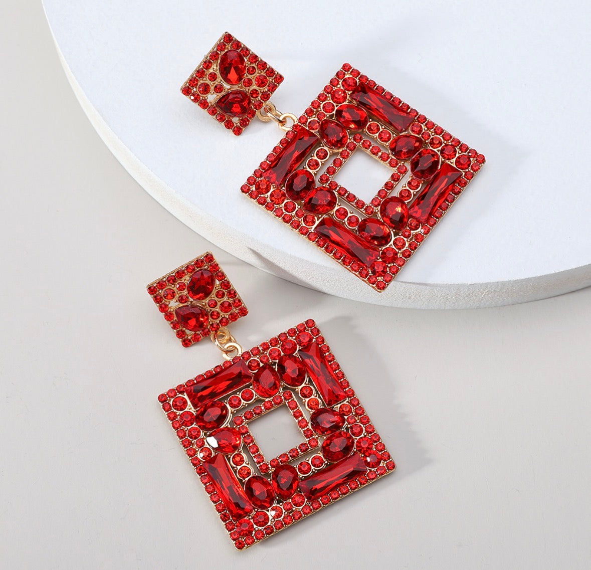 E5322 Aretes cuadro cristales rojos aleacion 6cm