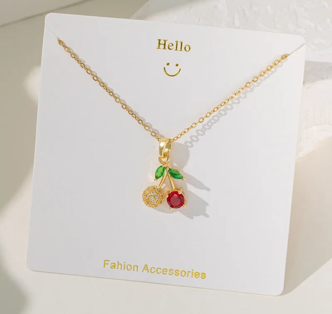J548 Collar cereza brillante acero inoxidable chapado en oro 18k largo 21cm dije 2cm
